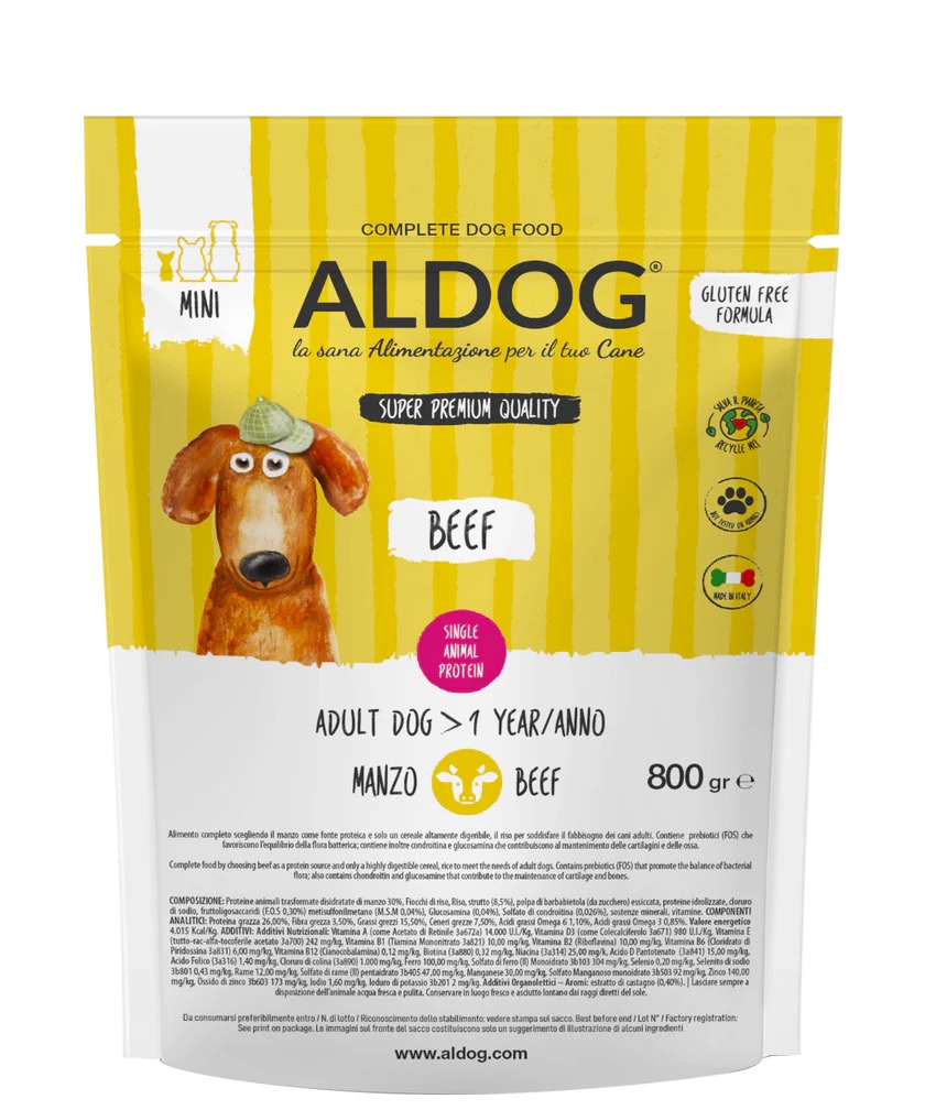 AlDog hovězí s rýží je specifická potrava pro psy, kteří mají problémy s potravinovou nesnášenlivostí. Jediným zdrojem proteinu je zde libové hovězí maso, které je lehce stravitelné a zároveň chutné. Spolu s výhradním použitím rýže zaručuje tato receptura zdravou a vyváženou potravu, která zabraňuje vzniku dermatitidy nebo jiných kožních problémů.